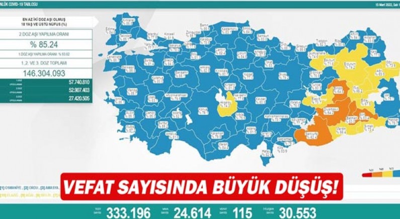Sağlık Bakanlığı, 15 Mart Corona virüs tablosunu paylaştı. Açıklanan tabloya göre son 24 saatte yapılan 333 bin 196 testte 24 bin 614 vaka tespit edildi. Koronavirüs nedeniyle 115 kişi hayatını kaybederken, 30 bin 553 kişinin de tedavisi ve karantinası sona erdi.
