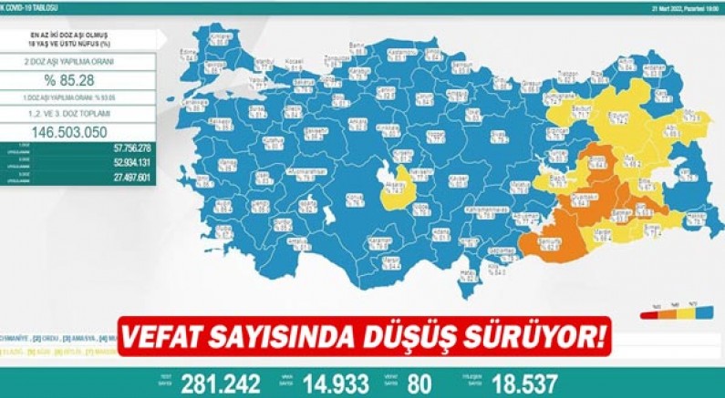 Sağlık Bakanlığı, 21 Mart Corona virüs tablosunu paylaştı. Açıklanan tabloya göre son 24 saatte yapılan 281 bin 242 testte 14 bin 933 vaka tespit edildi. Koronavirüs nedeniyle 80 kişi hayatını kaybederken, 18 bin 537 kişinin de tedavisi ve karantinası sona erdi.