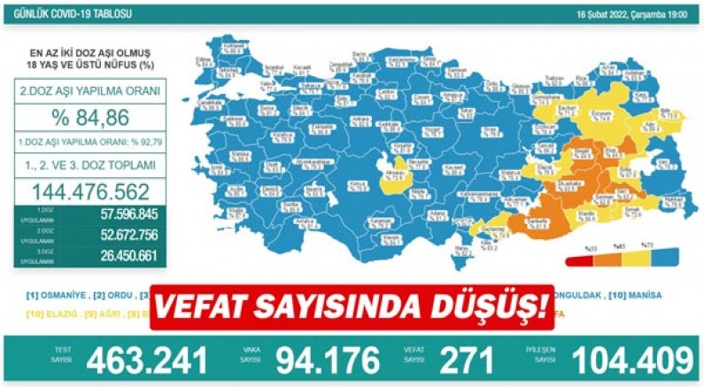 Sağlık Bakanlığı, 16 Şubat Corona virüs tablosunu ve aşılamada son durumu paylaştı. Türkiye'de son 24 saatte 463 bin 241 test yapılırken 94 bin 176 Vaka belirlendi. Koronavirüsten maalesef 271 vatandaşımızı kaybederken hastalığa yakalanıp iyileşen sayısı 104 bin 409 oldu.