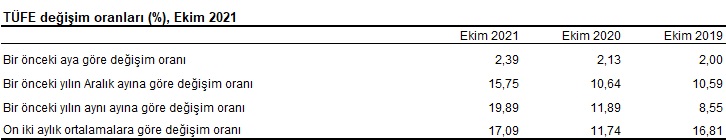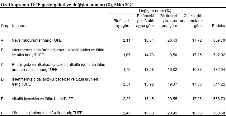 İşlenmemiş gıda ürünleri, enerji, alkollü içkiler ve tütün ile altın hariç TÜFE'de 2021 yılı Ekim ayında bir önceki aya göre %1,85, bir önceki yılın Aralık ayına göre %14,73, bir önceki yılın aynı ayına göre %18,50 ve on iki aylık ortalamalara göre %17,25 artış gerçekleşti.