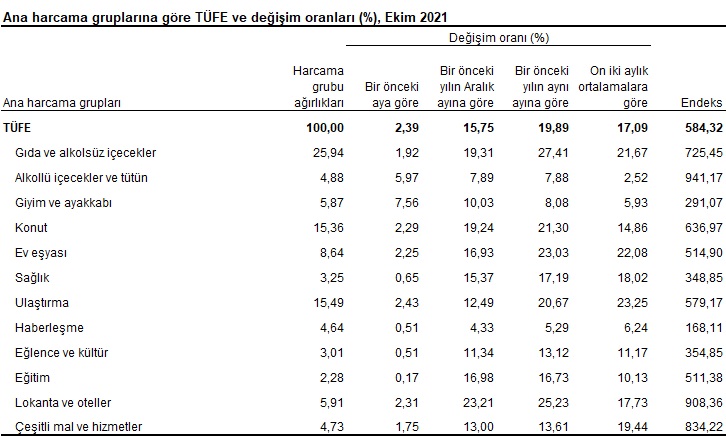 Ana harcama grupları itibarıyla 2021 yılı Ekim ayında en az artış gösteren ana gruplar %0,17 ile eğitim, %0,51 ile eğlence ve kültür ile haberleşme oldu. Buna karşılık, 2021 yılı Ekim ayında artışın yüksek olduğu gruplar ise sırasıyla, %7,56 ile giyim ve ayakkabı, %5,97 ile alkollü içecekler ve tütün ve %2,43 ile ulaştırma oldu.