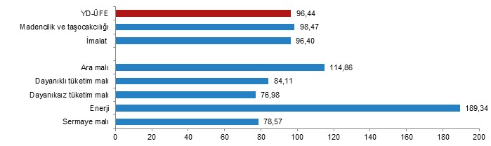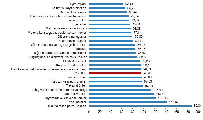 YD-ÜFE sektörlerinden giyim eşyası %62,40, basım ve kayıt hizmetleri %66,72, deri ve ilgili ürünler %69,44 ile endekslerin en az arttığı alt sektörler oldu. Buna karşılık kok ve rafine petrol ürünleri %189,34, ana metaller %142,97, kimyasallar ve kimyasal ürünler %122,46 ile endekslerin en fazla arttığı alt sektörler oldu.
