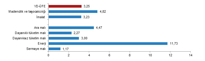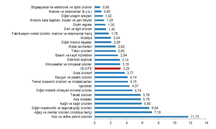YD-ÜFE sektörlerinden bilgisayarlar ile elektronik ve optik ürünler %0,69, makine ve ekipmanlar (b.y.s) %0,85, diğer ulaşım araçları %1,02 ile endekslerin en az arttığı alt sektörler oldu. Buna karşılık kok ve rafine petrol ürünleri %11,73, ağaç ve mantar ürünleri (mobilya hariç) %7,18, diğer madencilik ve taşocakçılığı ürünleri %6,84 ile endeksin en çok arttığı alt sektörler oldu.