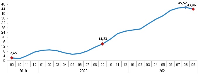 Yİ-ÜFE (2003=100) 2021 yılı Eylül ayında bir önceki aya göre %1,55, bir önceki yılın Aralık ayına göre %30,50, bir önceki yılın aynı ayına göre %43,96 ve on iki aylık ortalamalara göre %33,83 artış gösterdi.