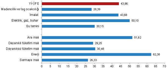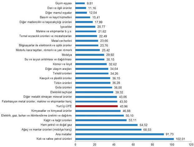 Yıllık en düşük artış; %9,81 ile giyim eşyası, %11,16 ile deri ve ilgili ürünler, %12,04 ile diğer mamul eşyalar olarak gerçekleşti. Buna karşılık kok ve rafine petrol ürünleri %102,01, ana metaller %91,73, ağaç ve mantar ürünleri (mobilya hariç) %68,53 ile endekslerin en fazla arttığı alt sektörler oldu.