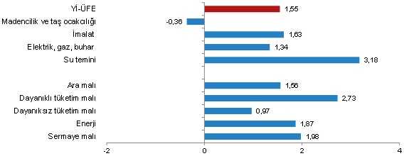 Ana sanayi gruplarının aylık değişimleri; ara malında %1,56, dayanıklı tüketim malında %2,73, dayanıksız tüketim malında %0,97, enerjide %1,87, sermaye malında %1,98 artış olarak gerçekleşti.