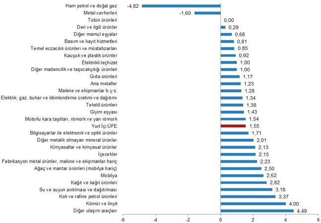 Aylık azalış; %4,82 ile ham petrol ve doğal gaz, %1,60 ile metal cevherleri alt sektörlerinde gerçekleşti. Buna karşılık diğer ulaşım araçları %4,49, kömür ve linyit %4,00, kok ve rafine petrol ürünleri %3,37 ile endekslerin en fazla arttığı alt sektörler oldu.