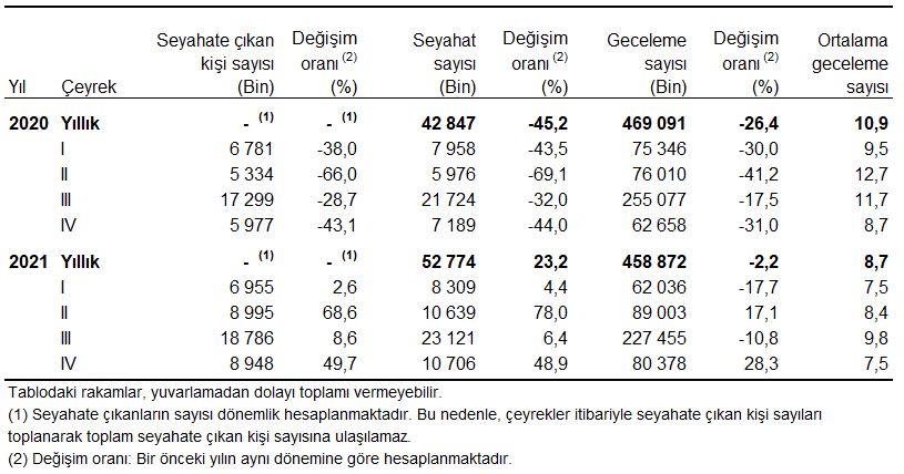 Yıllık olarak değerlendirildiğinde, toplam seyahat sayısı bir önceki yıla göre %23,2 artarak 52 milyon 774 bin olarak gerçekleşti. Bu yılda seyahate çıkanların yaptıkları toplam geceleme sayısı bir önceki yıla göre %2,2 azalarak 458 milyon 872 bin olarak gerçekleşti. Ortalama geceleme sayısı 2021 yılında 8,7 gece oldu.