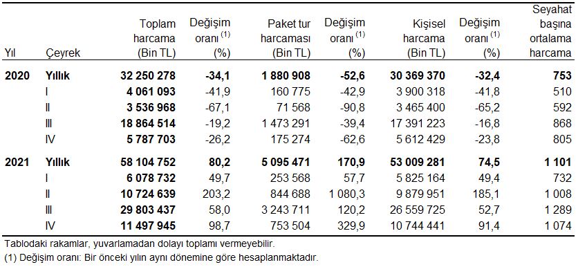 Yerli turistlerin, yurt içinde yaptıkları seyahat harcamaları 2021 yılının IV. çeyreğinde bir önceki yılın aynı çeyreğine göre %98,7 artarak 11 milyar 497 milyon 945 bin TL olarak gerçekleşti. Bu harcamaların %93,4'ünü 10 milyar 744 milyon 441 bin TL ile kişisel harcamalar, %6,6'sını ise 753 milyon 504 bin TL ile paket tur harcamaları oluşturdu. Seyahat başına yapılan ortalama harcama ise 1 074 TL oldu.