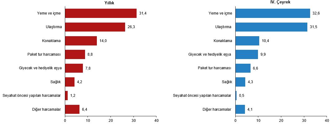 Yıllık olarak harcama türlerinin seyahat harcamaları içerisindeki dağılım oranları incelendiğinde ise en fazla paya %31,4 ile yeme ve içme harcamaları, %26,3 ile ulaştırma harcamaları ve %14 ile konaklama harcamaları sahip oldu. Bu harcama türlerinin geçen yılın aynı dönemine göre değişim oranları incelendiğinde ise yeme ve içme harcamalarında %54,7, ulaştırma harcamalarında %62,6 ve konaklama harcamalarında ise %118,9'luk artış görüldü.