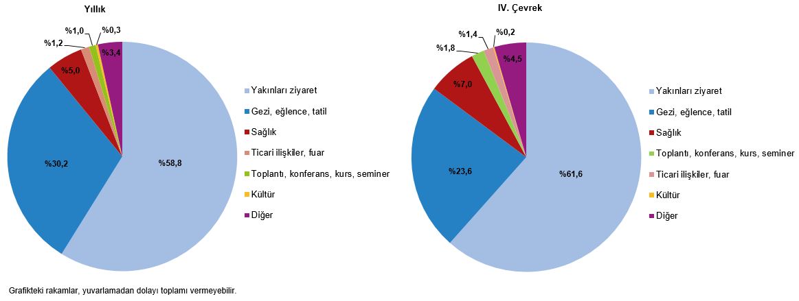 Seyahate çıkış amaçları yıllık olarak değerlendirildiğinde ise, %58,8 ile "yakınları ziyaret' birinci sırada yer alırken, ikinci sırada %30,2 ile "gezi, eğlence, tatil", üçüncü sırada ise %5 ile "sağlık" amacıyla yapılan seyahatler yer aldı.
