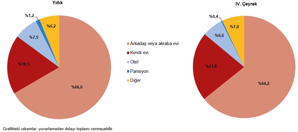 Konaklama türleri yıllık olarak değerlendirildiğinde, seyahate çıkanlar 305 milyon 542 bin geceleme sayısı ile en çok "arkadaş veya akraba evinde" kaldı. İkinci sırada 84 milyon 814 bin geceleme ile "kendi evi" yer alırken, "otel" 34 milyon 218 bin geceleme sayısı ile üçüncü sırada yer aldı.