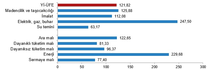 Ana sanayi gruplarının yıllık değişimleri; ara malında %122,65, dayanıklı tüketim malında %81,33, dayanıksız tüketim malında %96,37, enerjide %229,68 ve sermaye malında %77,40 artış olarak gerçekleşti.