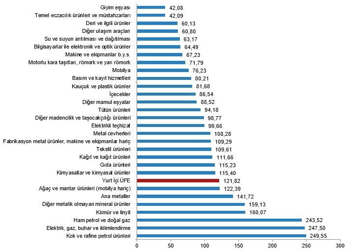 Yıllık en düşük artış; %42,08 ile giyim eşyası, %42,09 ile temel eczacılık ürünleri ve müstahzarları, %60,13 ile deri ve ilgili ürünler alt sektörlerinde gerçekleşti. Buna karşılık kok ve rafine petrol ürünleri %249,55, elektrik, gaz, buhar ve iklimlendirme %247,50, ham petrol ve doğal gaz %243,52 ile endekslerin en fazla arttığı alt sektörler oldu.